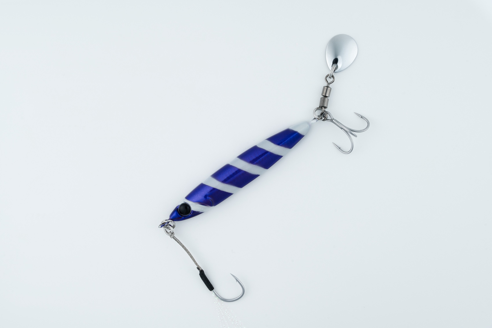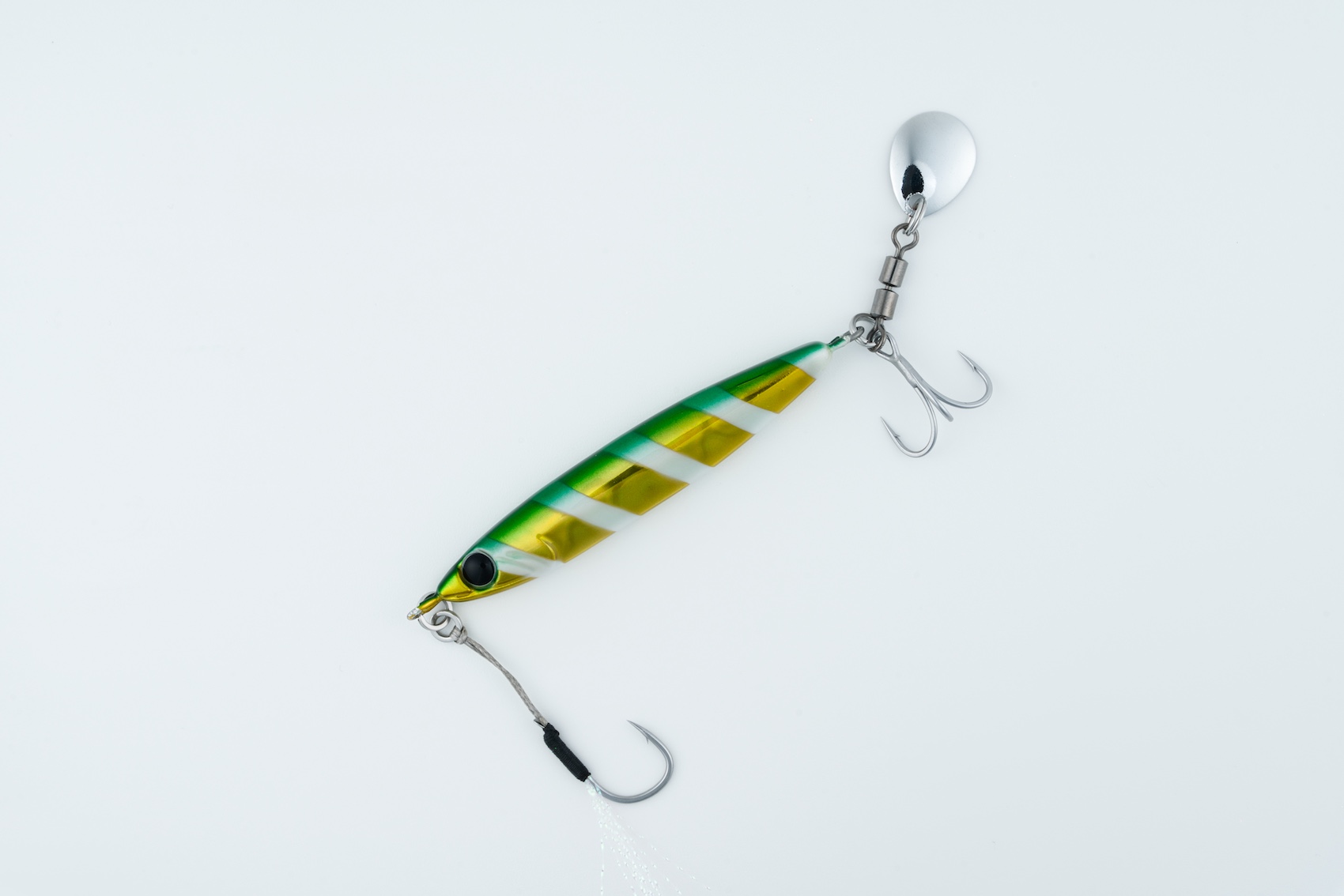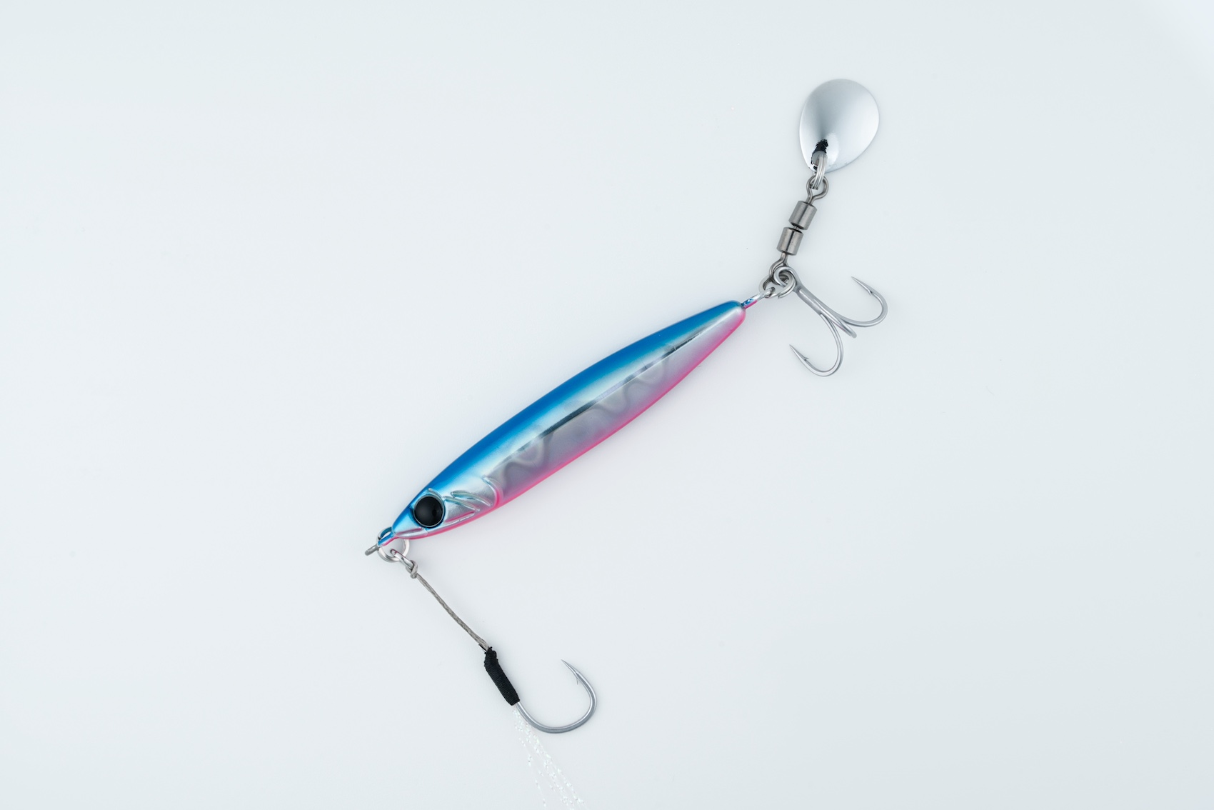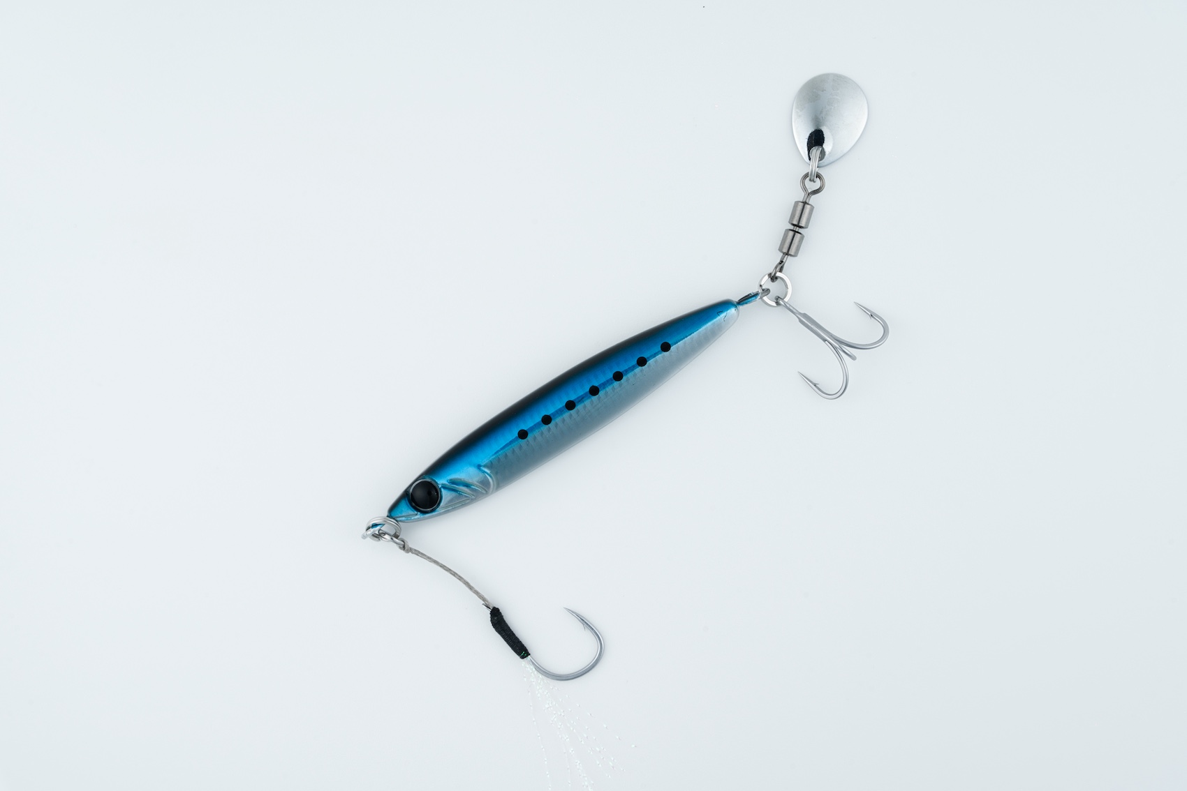 亜鉛合金(比重6.8)という低比重素材を採用したZサーディンをベースに、ブレイドチューンモデルとして再設計したZブレイド。左右対称の円柱型ボディに改良することで、ブレイドのアピール力と操作性を高いレベルで両立しました。低比重素材とブレイドの抵抗によってフォールスピードを抑え、狙ったレンジをより丁寧にトレース。フォール中にはブレイドが回転しながら強烈なフラッシングを生み、ターゲットの捕食本能を刺激します。また、後方重心設計と空気抵抗を抑えたボディ形状により、十分な飛距離も確保。広範囲を効率よく探ることができ、高速リトリーブ時でも水面へ飛び出しにくく、安定したスイミングでレンジをキープします。青物、フラットフィッシュ、太刀魚、ロックフィッシュなど、幅広いフィッシュイーターに対応するブレイド系メタルジグです。
